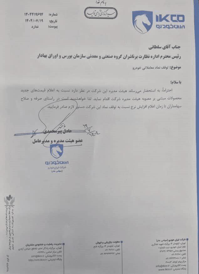 در نامهای که این شرکت خودروساز در کدال منتشر کرده است آمده است که احتراما به استحضار میرساند هیئت مدیره این شرکت در نظر دارد نسبت به اعلام قیمتهای جدید محصولات مبتنی بر مصوبه هیات مدیره شرکت اقدام کند.لذا خواهشمنتد است در راستای صرفه و صلاح سهامداران تا زمان اعلام افزایش نرخ نسبت به توقف نماد این شرکت دستور لازم صادر فرمایید.