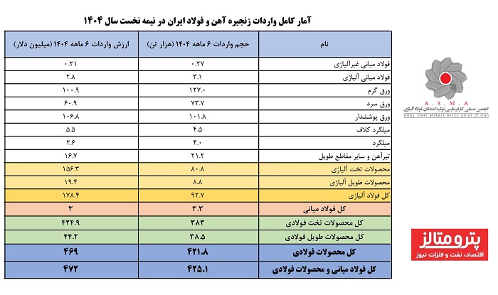 در مجموع، واردات فولاد آلیاژی (شامل فولاد میانی و محصولات نهایی آلیاژی) در نیمه نخست سال ۱۴۰۴ معادل ۹۲.۷ هزار تن و ارزشی برابر ۱۷۸.۴ میلیون دلار گزارش شده است که سهم قابل توجهی از ارزش کل واردات فولادی کشور را تشکیل میدهد.