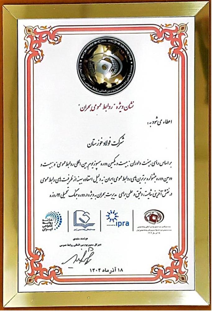 نشان ویژه روابط عمومی بحران به‌ ویژه در جنگ تحمیلی ۱۲ روزه به روابط عمومی شرکت فولاد خوزستان اعطا شد