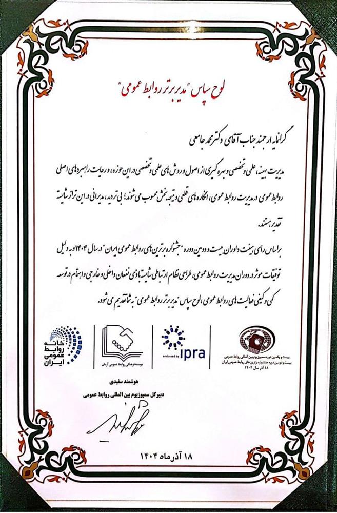 در سمپوزیوم و جشنواره یادشده که روز ۱۸ آذرماه ۱۴۰۴ با عنوان نقش و کارکردهای روابط عمومی راهبردی در بحران‌های جنگی در مرکز همایش‌های کتابخانه ملی ایران واقع در تهران برگزار شد، لوح و تندیس مدیر روابط عمومی برتر به محمد جامعی مدیر روابط عمومی اعطا شد که حسن شهیتی از کارشناسان این واحد به نیابت به‌روی سن رفته و لوح و نشان را دریافت نمود.
