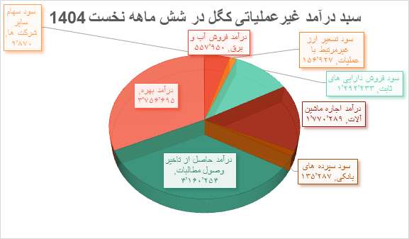 در شش ماهه نخست سال جاری کگل از محل تعدیلات انبارگردانی به رقم ۳ هزار و ۳۴۷ میلیارد ریال و از محل حمل و بارگیری درآمد ۳ هزار و ۵۴۰ میلیارد ریال کسب کرد که نسیت به دوره مشابه سال گذشته با افزایش ۲۸ درصدی همراه شد. این شرکت از بخش غیرعملیاتی نیز درآمد ۱۰ هزار و ۹۰۸ میلیارد ریالی به دست آورد که ۵۵۸ میلیارد ریال از محل فروش آب و برق، ۱۵۷ میلیارد ریال سود تسعیر ارز غیرمرتبط با عملیات، ۱ هزار و ۲۹۲ میلیارد ریال سود فروش داراییهای ثابت، ۱ هزار و ۷۷۰ میلیارد ریال درآمد اجاره ماشینآلات، ۱۳۵ میلیارد ریال سود سپردههای بانکی، ۴ هزار و ۱۶۰ میلیارد ریال درآمد حاصل از تاخیر وصول مطالبات، ۳ هزار و ۷۵۷ میلیارد ریال درآمد بهره و ۱۰ میلیارد ریال سود سهام سایر شرکتها بوده است.