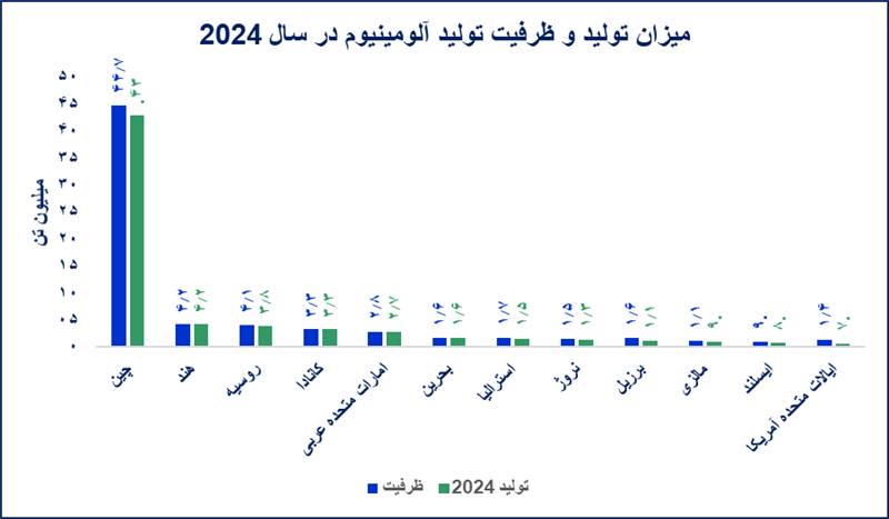 بر اساس گزارش سازمان زمینشناسی ایالات متحده (USGS)، در سال ۲۰۲۴ از ۶۴.۸ میلیون تن تولید آلومینیوم در جهان چین با تولید حدود ۴۳ میلیون تن آلومینیوم، با فاصلهای چشمگیر جایگاه بزرگترین تولیدکننده این فلز را در جهان به خود اختصاص داده است. پس از چین، هند با تولید تقریبی ۴.۲ میلیون تن و روسیه با حدود ۳.۸ میلیون تن، بهترتیب در رتبههای دوم و سوم تولید جهانی قرار دارند. این اختلاف قابلتوجه میان چین و سایر تولیدکنندگان، نقش تعیینکننده سیاستهای صنعتی، انرژی و زیستمحیطی این کشور را در جهتدهی به بازار جهانی آلومینیوم برجسته میکند. تمرکز بالای تولید در چند کشور محدود، بهویژه چین، سبب شده است بازار آلومینیوم در برابر ریسکهای ژئوپلیتیک، محدودیتهای انرژی و تغییرات سیاستگذاری، حساسیت بالایی داشته باشد؛ عاملی که در سالهای اخیر یکی از محرکهای اصلی نوسانات قیمتی این فلز محسوب میشود.