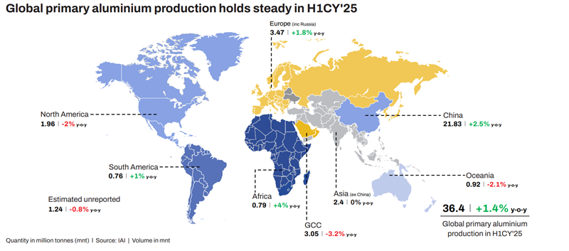 عملکرد بازار در نیمه نخست سال ۲۰۲۵ نیز نشانههایی از تداوم این تابآوری را نشان داد. تولید جهانی آلومینیوم در این دوره به ۳۶.۴ میلیون تن رسید که نسبت به مدت مشابه سال قبل ۱.۴ درصد افزایش را ثبت کرد. چین بار دیگر با رشد ۲.۵ درصدی در صدر قرار داشت و در کنار آن، کشورهایی مانند هند، برخی کشورهای اروپایی و منطقه جنوبشرق آسیا نیز از طریق افزایش تدریجی ظرفیتها به رشد تولید کمک کردند. با این حال، افزایش هزینههای آلومینا و انرژی، بهویژه برای تولیدکنندگان خارج از چین، به عاملی تعیینکننده در تصمیمگیریهای مربوط به توسعه ظرفیت و مدیریت حاشیه سود تبدیل شده است.