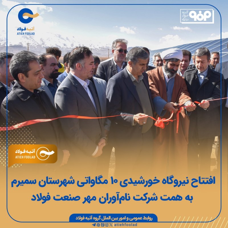 به گزارش تجارت، معدن و فولاد: نیروگاه خورشیدی ۱۰ مگاواتی شهرستان سمیرم با حضور جمالینژاد استاندار اصفهان، طهماسبی معاون سرمایهگذاری و راهبری شرکتهای گروه فولاد مبارکه، مهدی کویتی مدیرعامل گروه سرمایهگذاری آتیهفولاد و محمد تاجمیر ریاحی مدیر عامل هلدینگ فولاد متیل به بهرهبرداری رسید. این آیین افتتاح با حضور جمعی از مدیران استانی، مسئولان محلی و مدیران برگزار شد و نیروگاه مذکور پس از طی مراحل فنی و اجرایی، بهصورت رسمی وارد مدار تولید برق شد.